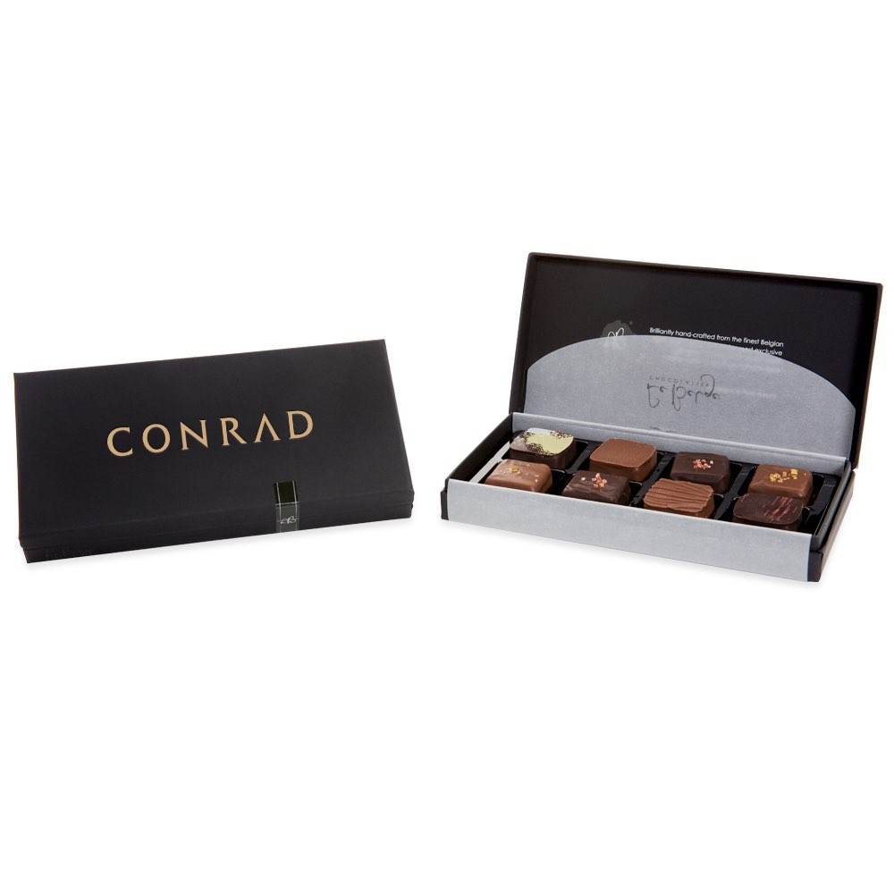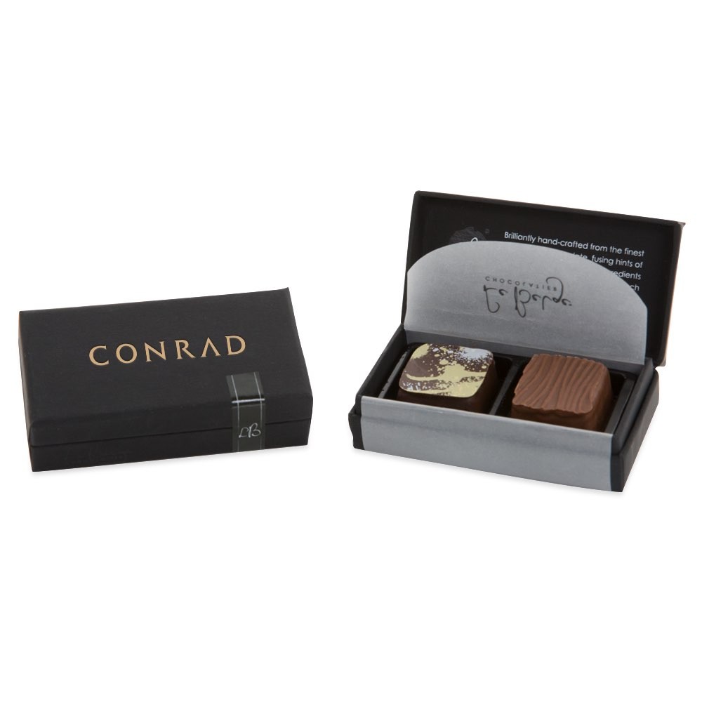 Our soft touch black Studio truffle boxes are foil stamped with a gold Conrad logo and include assorted Studio handmade truffles. Assorted flavors include: Tiramisu, citron, vanilla cream, hazelnut orange peel, raspberry pomegranate, and buttered sea salt.