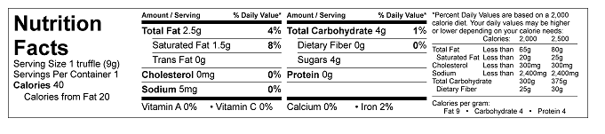 INGREDIENTS: Dark chocolate (sugar, cocoa butter, cocoa mass, soy lecithin [emulsifier], natural vanilla extract), filling (milk chocolate [sugar, cocoa butter, cocoa mass, whole milk powder, soy lecithin [emulsifier], natural vanilla extract], evaporated milk [milk, dipotassium phosphate, carrageenan, vitamin D3], granulated sugar, anhydrous butter oil [milkfat], invert sugar, sorbitol, vanilla bean paste [sugar, water, vanilla extract, vanilla beans, gum tragacanth [natural thickener], sea salt, sorbic acid, and potassium sorbate [preservatives]), truffle design (cocoa butter, sugar, titanium dioxide, and FD&C blue # 2).