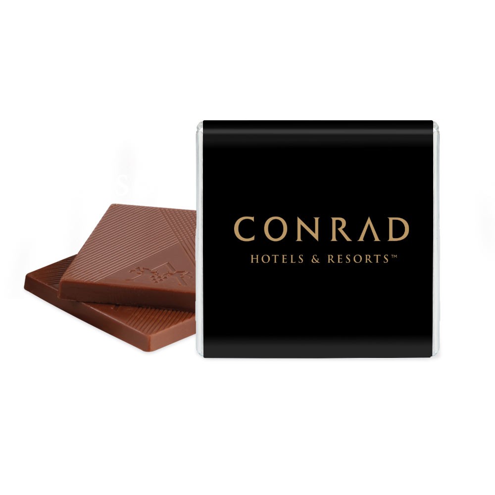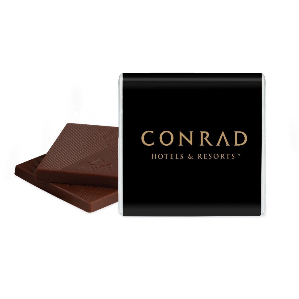 1.75" Deluxe chocolate squares wrapped with Conrad logo sleeve.