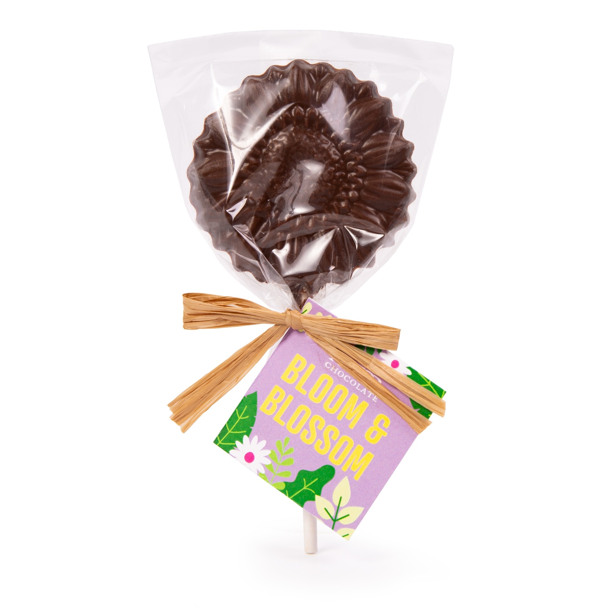 A delightful milk chocolate shaped sunflower lollipop wrapped in a cello bag with a hand tied raffia Kraft ribbon and festive hang tag.