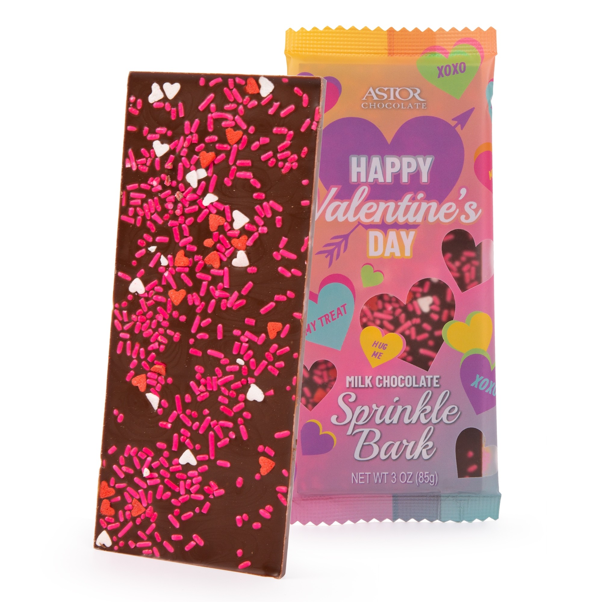 3oz creamy milk chocolate bark topped with heart sprinkles flow packed with “Happy Valentine’s Day” wrapper