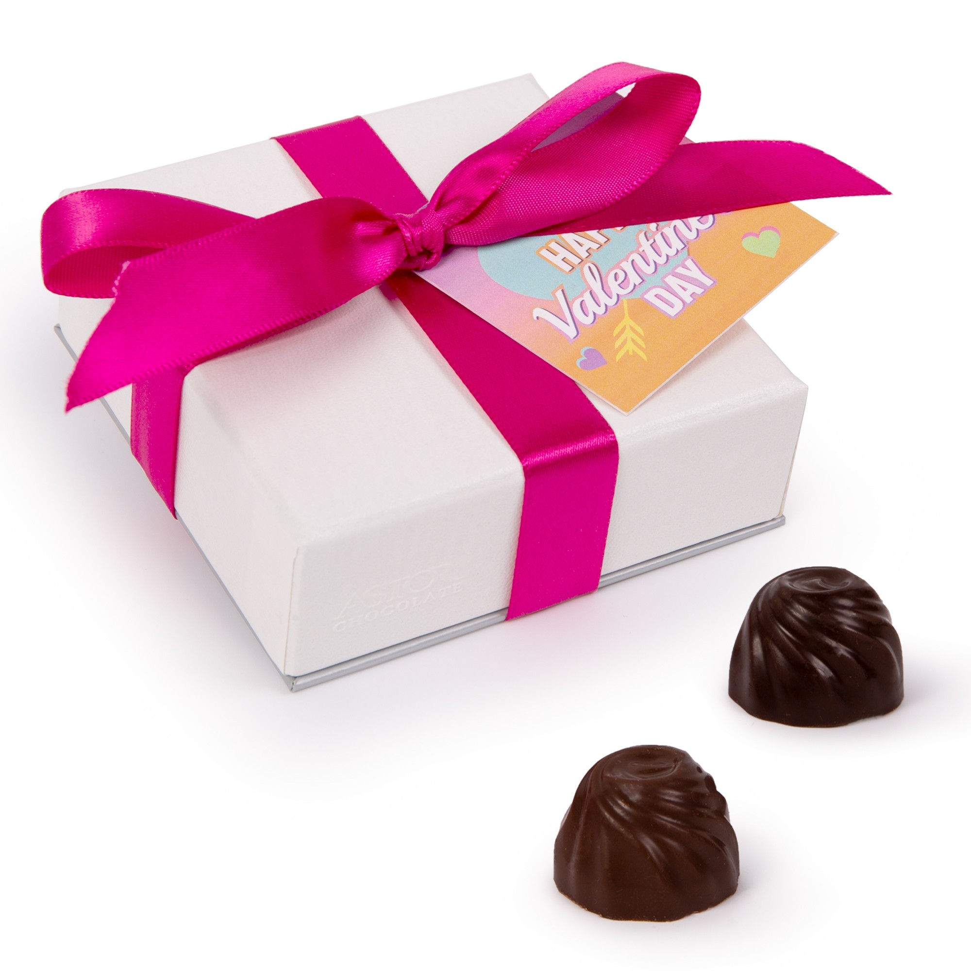 4pc White Deco Truffle Gift Box -Contains 4 swirl milk and dark truffles with pink hand-tied ribbon and “Happy Valentine’s Day” hang tag