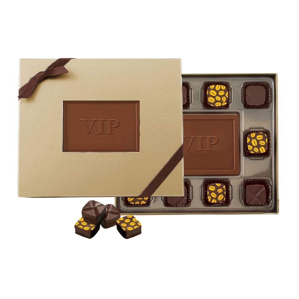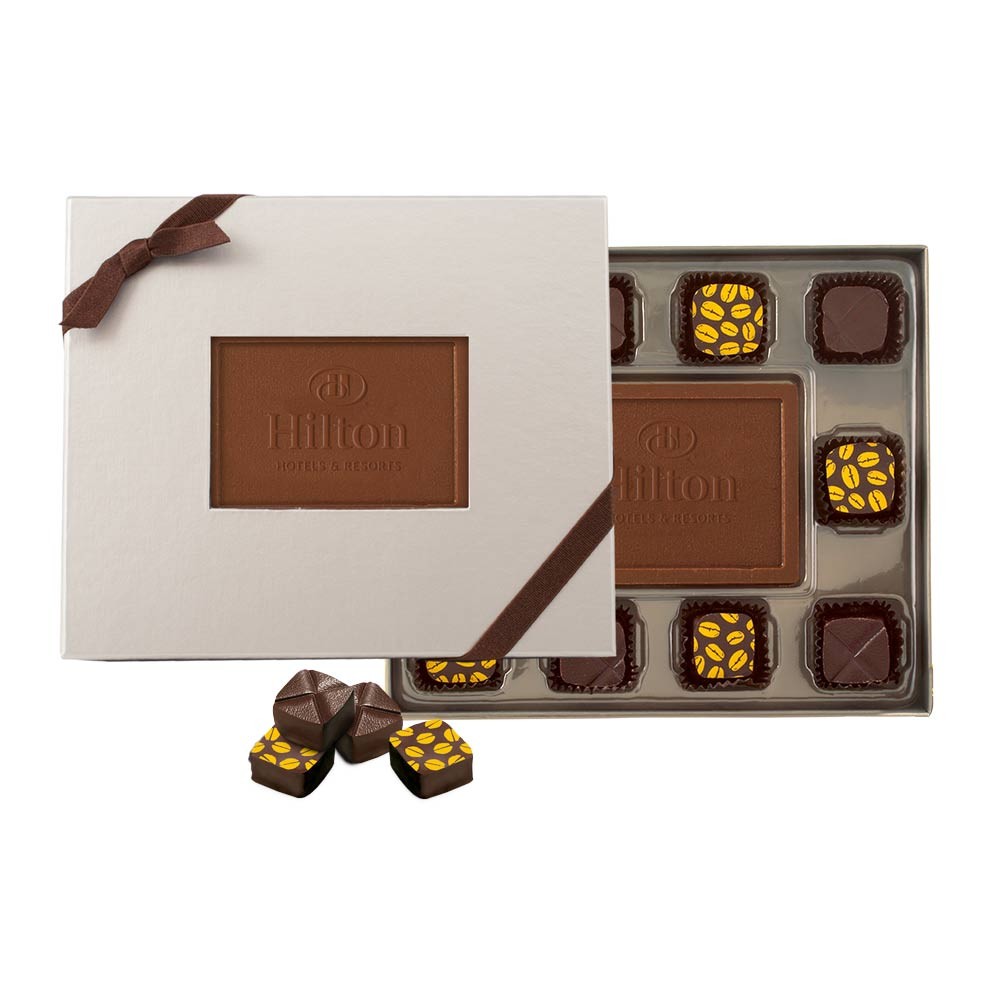 Our VIP Executive Truffle Boxes contain 10 assorted Signature handmade truffles with a VIP or custom Hilton Hotels & Resorts milk chocolate center plaque. Available in silver or gold, finished with a brown stretch ribbon.